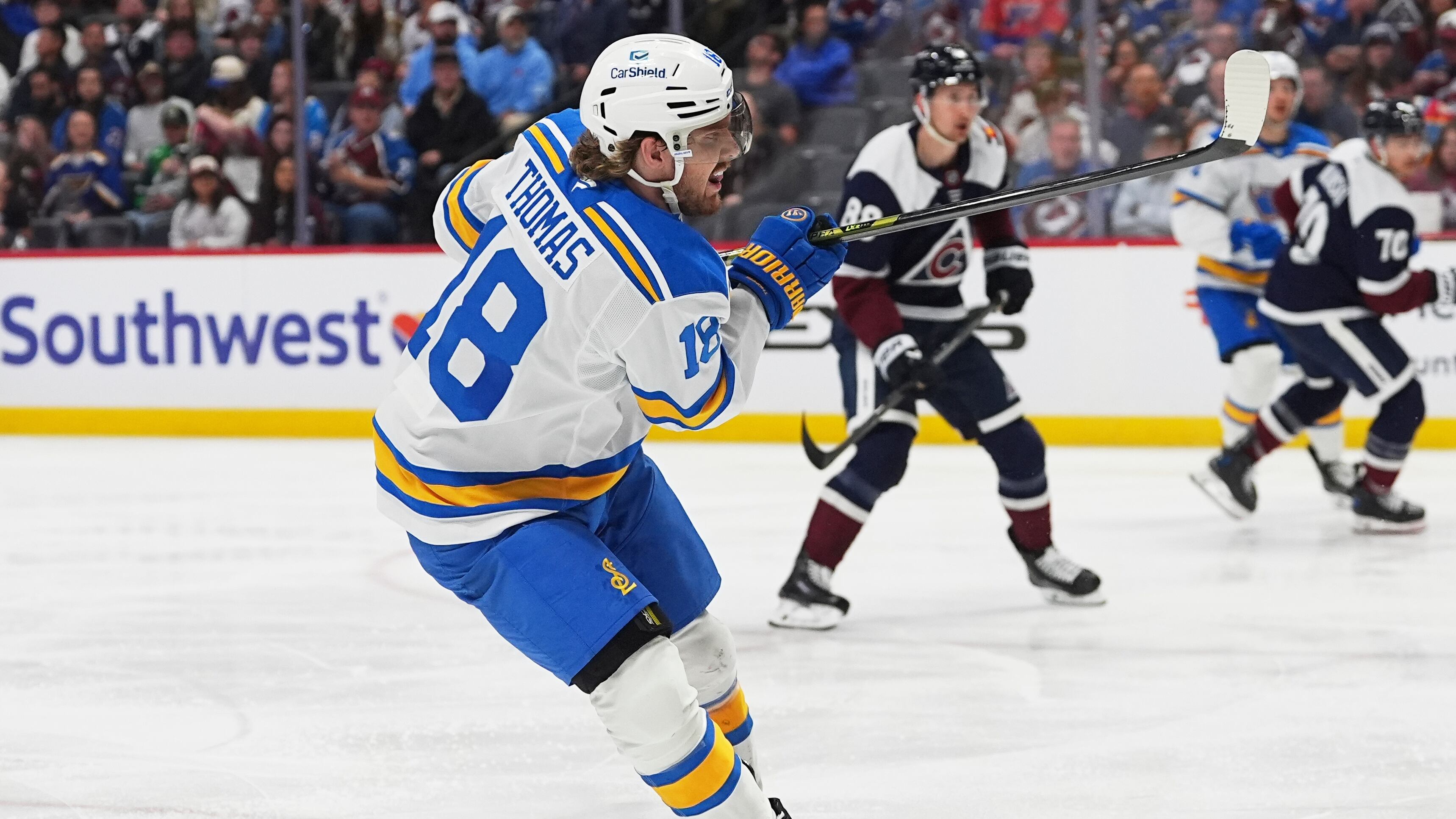 DENVER (AP) — Robert Thomas broke a tie with 2:50 left to complete his first NHL hat trick and the St. Louis Blues kept their late postseason charge rolling with a 3-2 victory over the Colorado Avalanche on Sunday night to open a home-and-home set.
